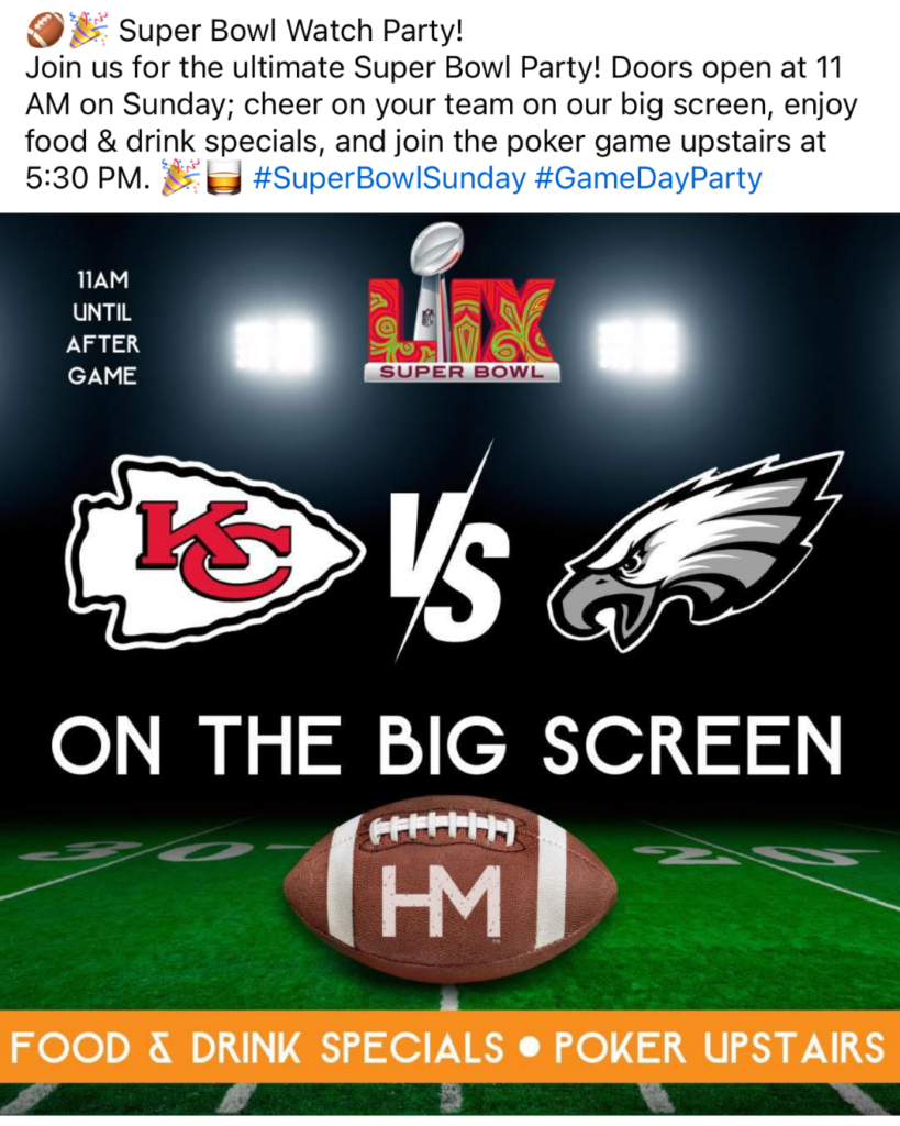 Watch the game and enjoy food and drinks: Herman Marshall Whiskey is hosting a big game watch party on the big screen. Get there early for cocktails, food, and even a poker game upstairs.