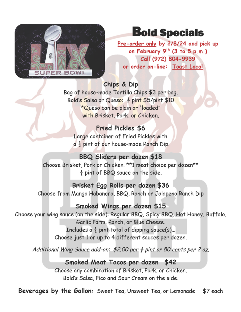 Order takeout: Football is always better with barbecue, and Bold BBQ Pit has you covered with a variety of specials and take-out meals. Pre-order by February 8th.