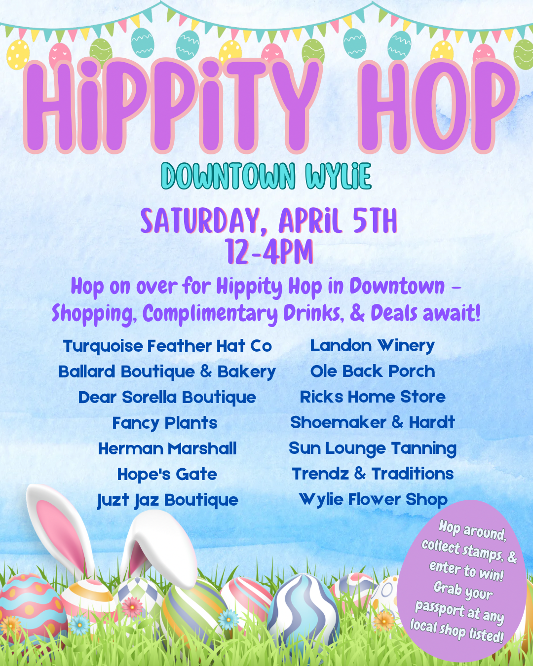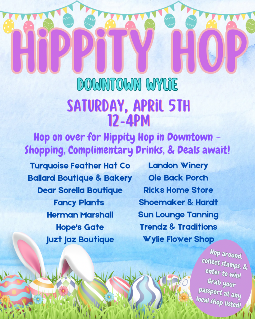 Shop local, and while you’re at it, enjoy complimentary drinks and have a chance to win a prize at this free event in historic downtown Wylie. Hippity Hop takes place on April 5th from 12 PM to 4 PM.