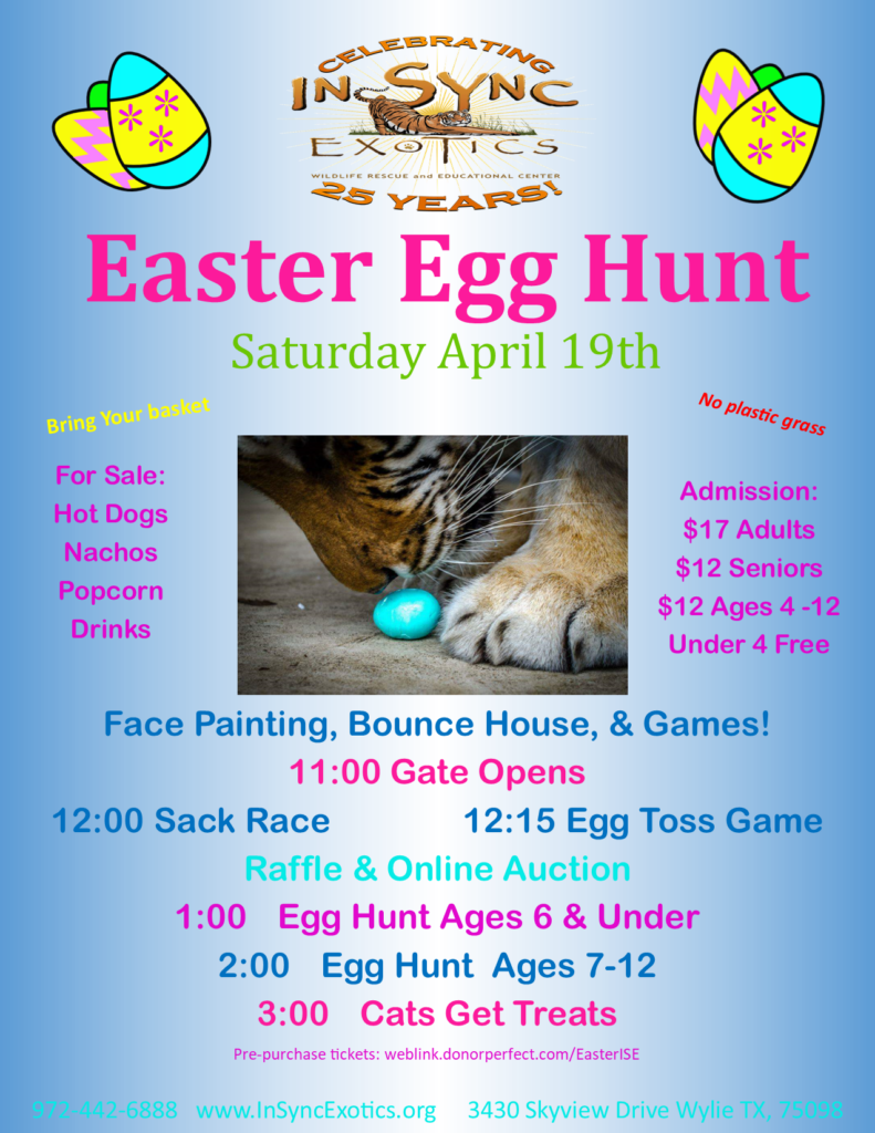 In-Sync Exotics is hosting an Easter Egg hunt that benefits its big cats. Get tickets now to this popular event, which takes place on April 19th from 11 AM until 4 PM. Kids under four are free!