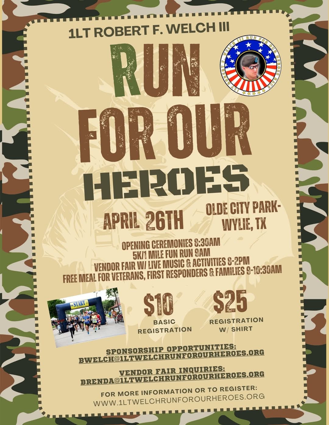 Run for a good cause at the 1LT Robert F Welch III Run for our Heroes 5k and Fun Run at Olde City Park on April 26th. Veterans and first responders receive a free meal.