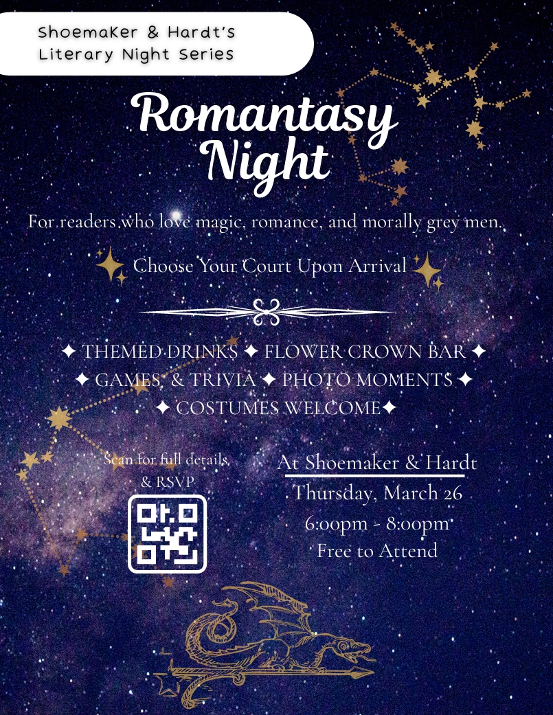 Join us for a free Romantasy Night at Shoemaker & Hardt featuring themed lattes, romantasy trivia, a live bracket competition, and a flower crown pop-up with Wylie Flower. Choose your court and celebrate all things magical and morally grey.