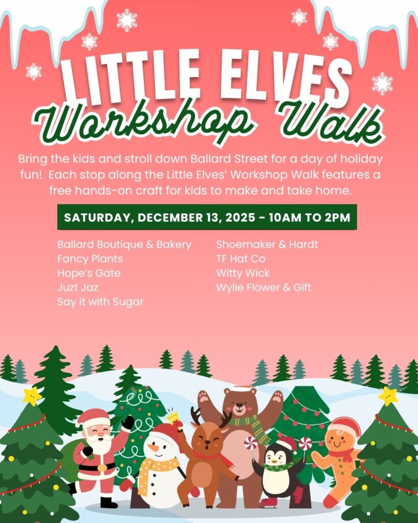 Bring the kids downtown for an exciting new hands-on experience for the littlest of shoppers. Participating stores will be offering free make-and-take crafts for kids. Stop by one store, or visit them all for an amazing crafting experience. The event takes place on Saturday, December 13th, from 10am until 2pm. Participating stores include: Ballard Boutique & Bakery, Fancy Plants, Hope’s Gate, Juzt Jaz, Say it with Sugar, Shoemaker & Hardt, TF Hat Co, Witty Wick, Wylie Flower & Gift.
