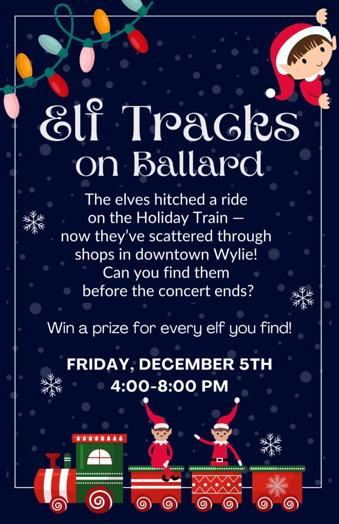 Train tracks aren’t the only thing running through historic downtown Wylie! Apparently, a bunch of elves are riding in on the Holiday Train, and we need YOU to find them. Search downtown shops for the missing elves from 4 PM – 8 PM on Friday, December 5th. Participating shops are: TF Hat Co., Hope’s Gate, Witty Wicks, Fancy Plants, Shoemaker & Hardt, Ballard Boutique & Bakery, Juzt Jaz, Wylie Flower & Gift, Landon Winery, Say It With Sugar, and Sun Lounge Tanning Studio.