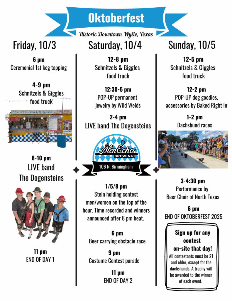 There’s no need to head overseas for an Oktoberfest experience. This year, you can enjoy Wylie’s very own Oktoberfest celebration at Glen Echo Brewing, located a block away from Ballard on N Birmingham. This three-day event starts at 6 PM on Friday, October 3rd, and runs through the weekend, wrapping on the 5th with a 3:30 PM performance of the Beer Choir of North Texas (yes, that is a thing, and yes, they will be gracing Wylie with their presence on October 5th).