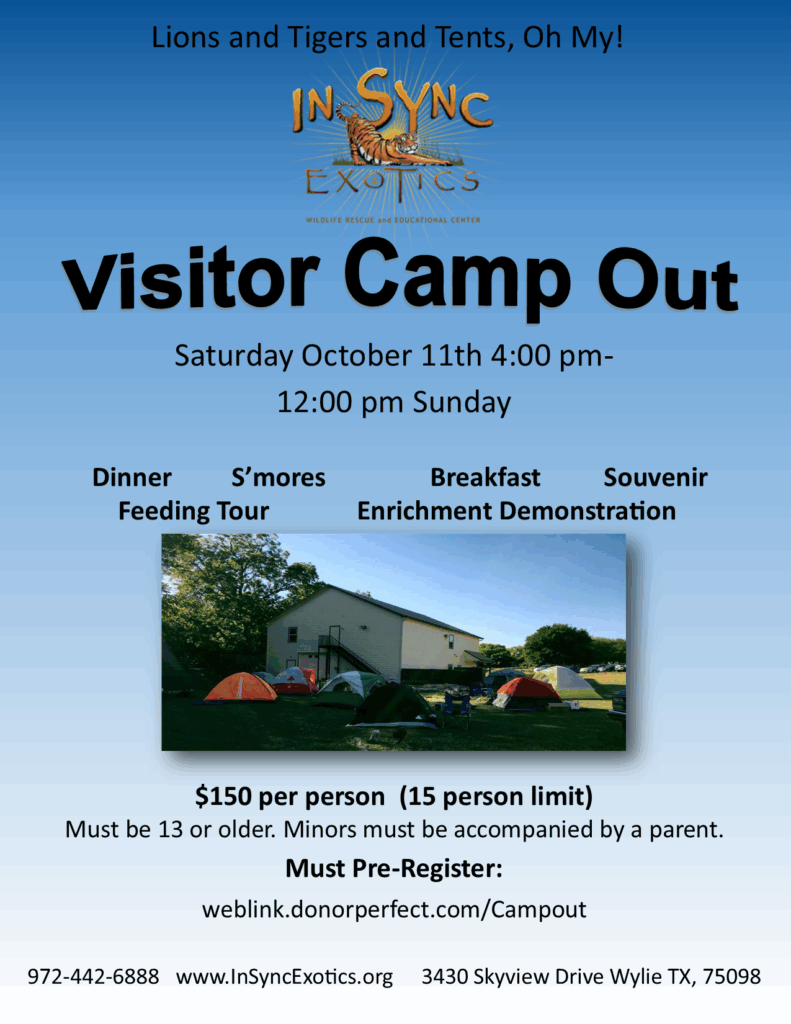 Have you ever wondered what it’s like to sleep under the stars … surrounded by big cats? The In-Sync Exotics Camp Out gives you the chance to do just that! You’ll get dinner, breakfast, a feeding tour, and a chance to camp next to a tiger. What more could you want? This event has very limited space, so get your tickets soon.