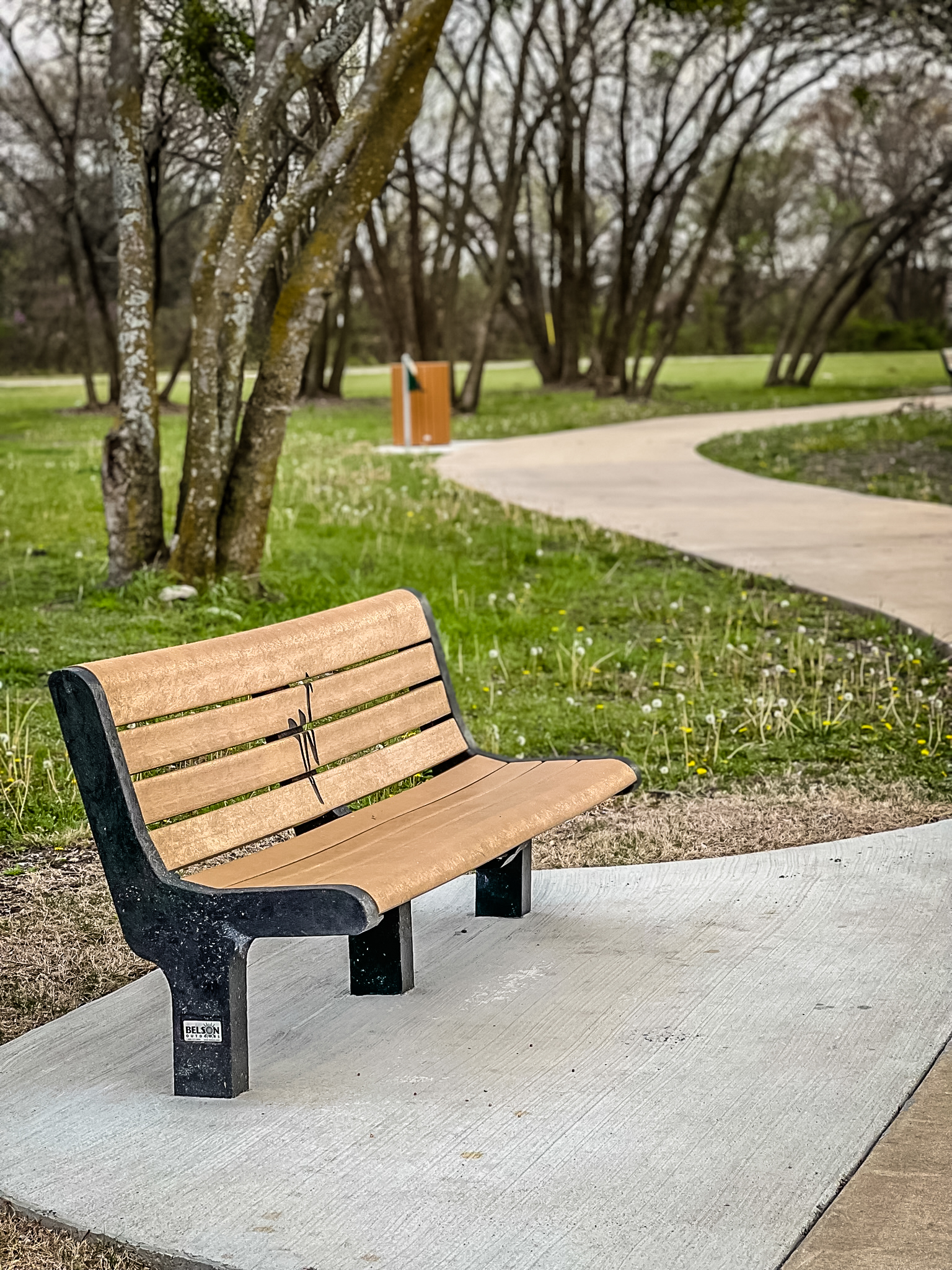Founders Park in Wylie has a paved walking trail that is a little over a mile long. This trail does not have much tree coverage, but it’s a popular place to walk or jog on nice weather days! There is also a popular playground at Founders (commonly called The Pirate Park by the 5 & under crowd). As long as you aren’t there on a game day (soccer/football/softball), you’ll have plenty of parking options. Parking is tight on Saturday mornings during soccer season.